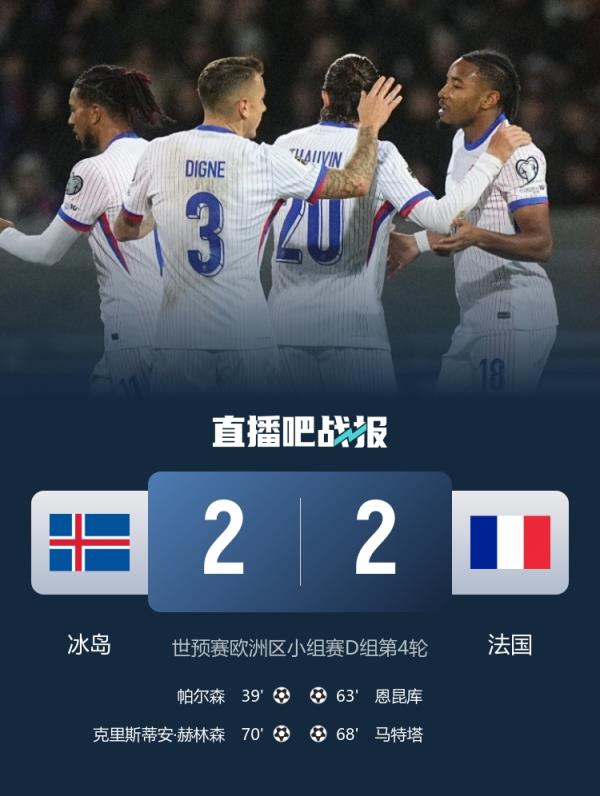 法国本轮世预赛2-2战平冰岛,本场恩昆库、马特塔进球。