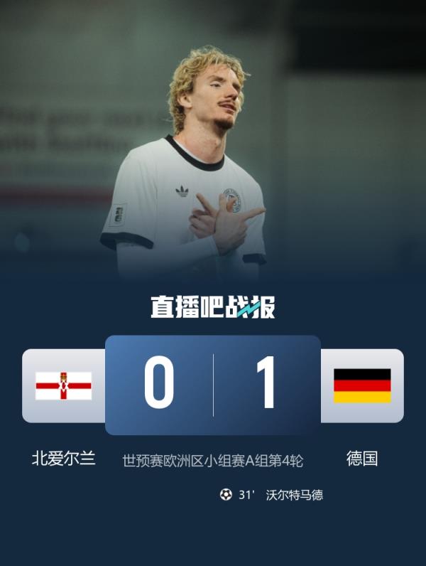 世预赛德国挑战北爱尔兰,沃尔特马德头球破门,下半场阿德耶米失单刀,德国1-0北爱尔兰取得三连胜。