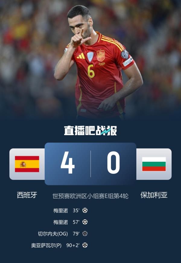 世预赛欧洲区小组赛E组第4轮,西班牙4-0大胜保加利亚,梅里诺梅开二度。