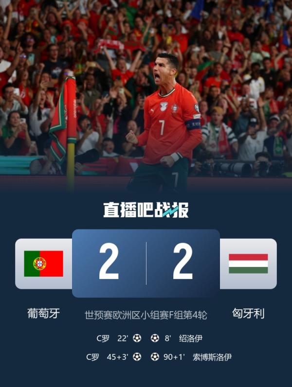世预赛欧洲区小组赛F组第4轮,葡萄牙2-2匈牙利,无缘本轮晋级世界杯正赛,C罗梅开二度。