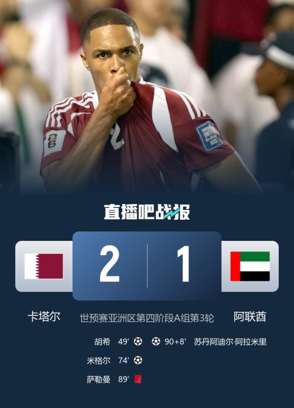 世预赛亚洲区第四阶段A组第3轮,10人卡塔尔2-1战胜阿联酋,晋级2026年世界杯正赛。