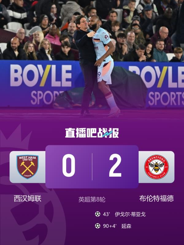 英超第8轮,西汉姆联0-2布伦特福德,遭遇主场4连败。