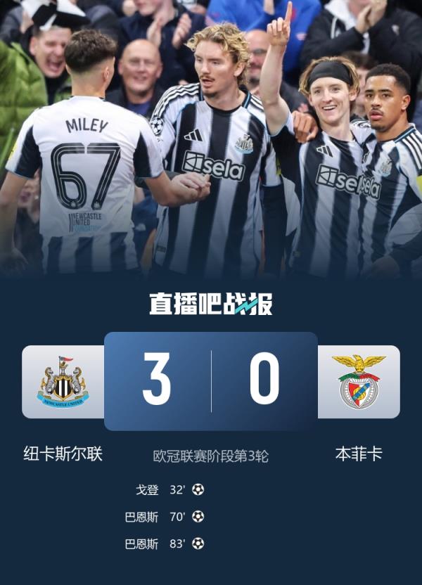 10月22日讯 欧冠联赛阶段第3轮首个比赛日结束,3场英超球队(阿森纳、曼城、纽卡)的欧冠比赛都成功拿下胜利且成功零封对手。