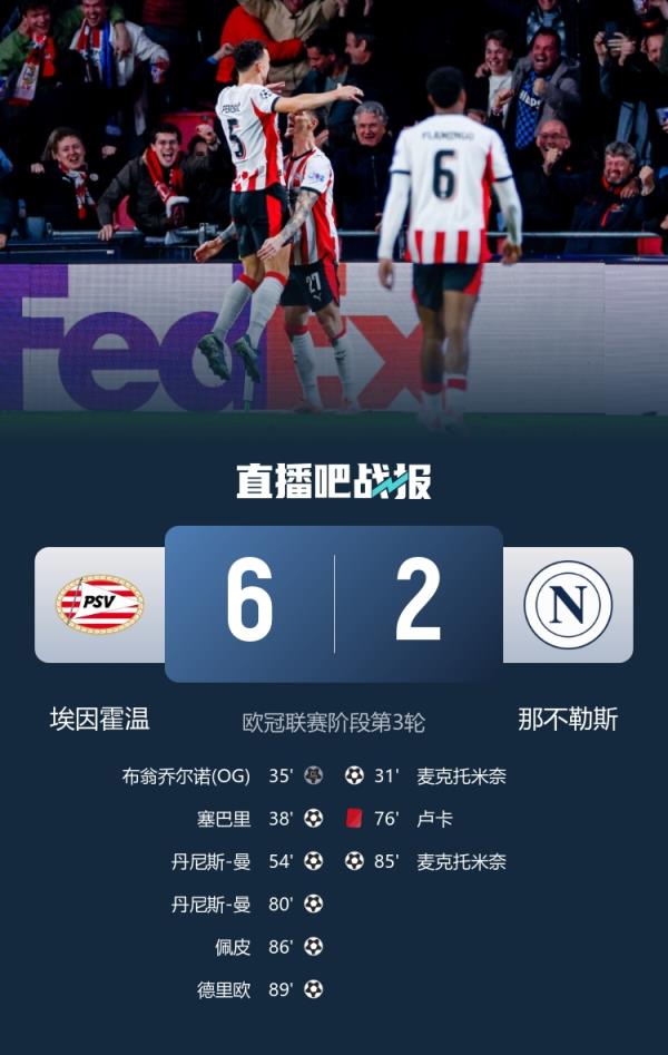 欧冠第3轮第一比赛日9场比赛全部结束,这9场比赛一共轰进43球(场均4.8球),其中有三支球队单场轰出6+进球(巴萨6-1奥林匹亚科斯、巴黎7-2勒沃库森、埃因霍温6-2那不勒斯)。